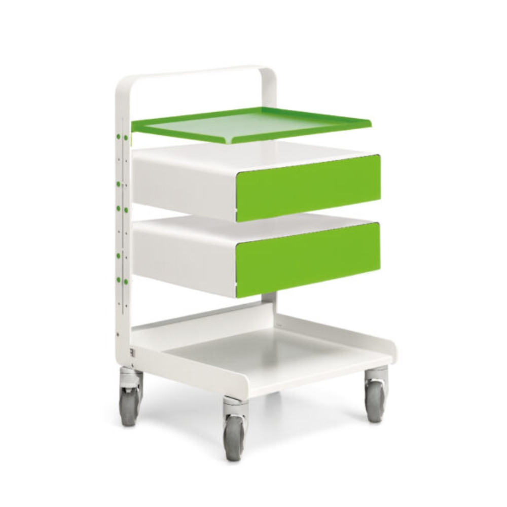 Corpul mobil Friday Double Techno Rossicaws cu o etajera si doua sertare este o solutie simpla de organizare si transport pentru interventiile stomatologice care necesita spatiu de depozitare. Rotile din spate sunt dotate cu sistem de franare. Etajera si sertarele pot fi reglate pe inaltime in functie de necesitati, pana la inaltimea maxima de 85,5 cm.
